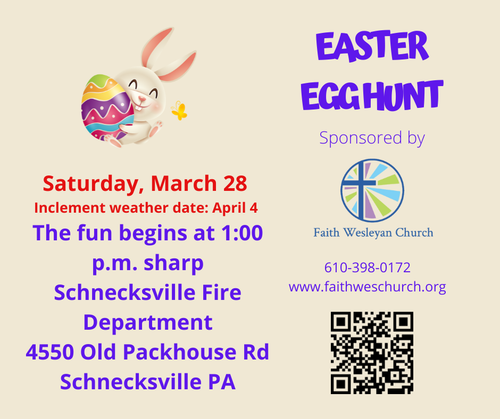 14th Annual Community Egg Hunt, March 28, 2026 (rain date April 4). There are prizes for every child, pony rides, games, free snacks and inflatable slides, etc. Join us for this FREE event by clicking the photo above to register.