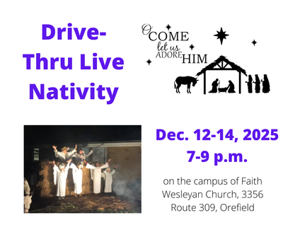 FREE EVENT! Join us one of these evenings for our Drive Thru Live Nativity which includes live animals and actors. Bring your smart phone if you would like narration as you drive through (not required, there are also signs along the path telling the story).